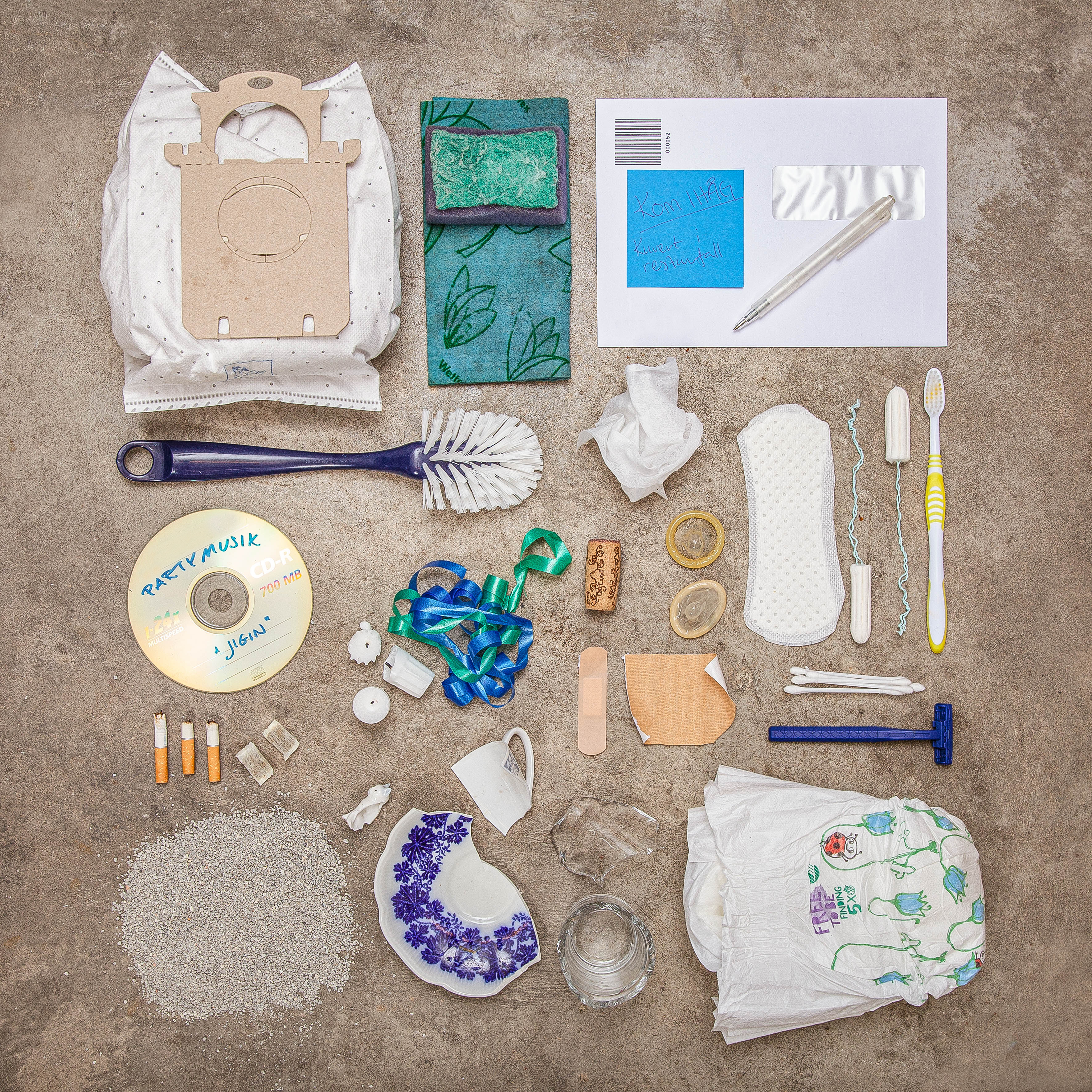 Bilder på varje avfallsslag: Tidningar, Restavfall, Matavfall, Pappersförpackningar, Plastförpackningar, Metallförpackningar, Färgade glasförpackningar, Ofärgade glasförpackningar, Grovavfall